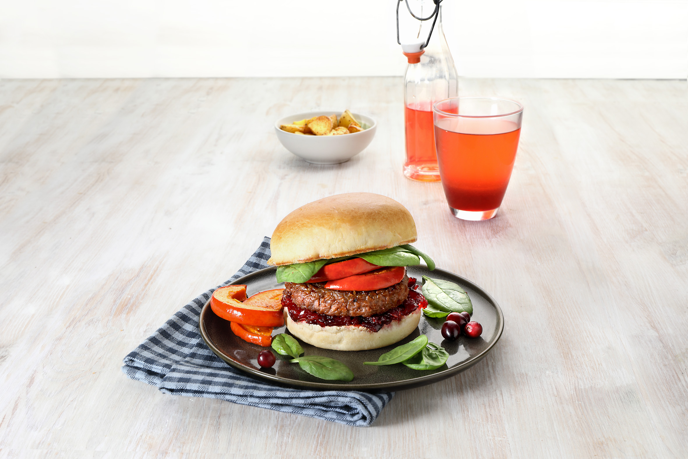 Beyond-Burger mit Cranberry-Sauce, Kürbis und Spinat